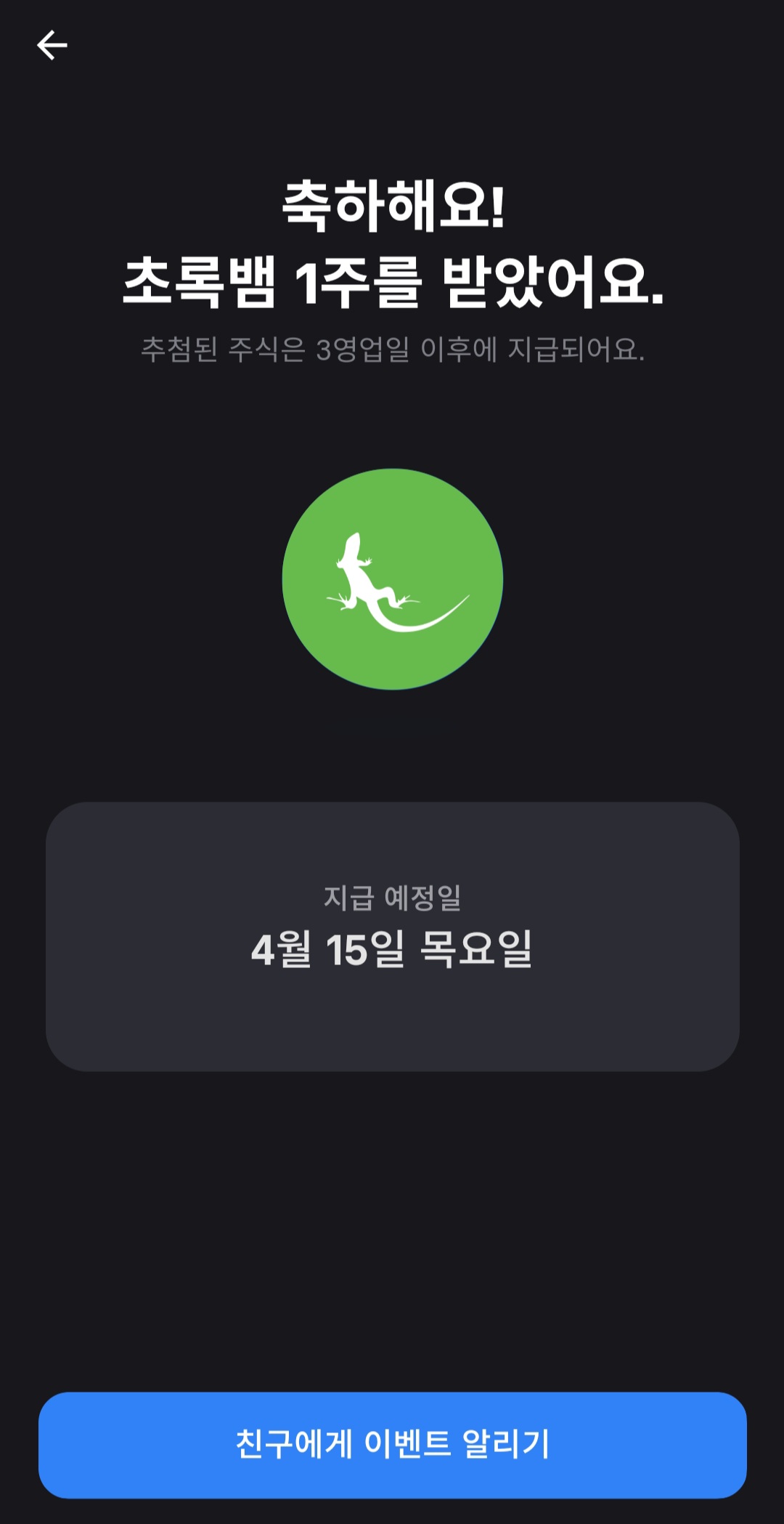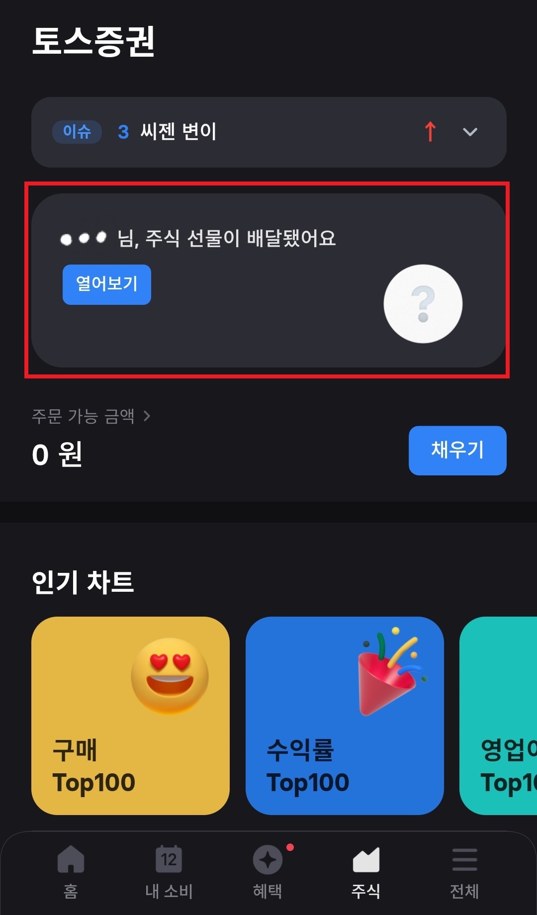 계좌 개설이 끝나면 주식 선물이 배달되었다는 안내가 뜹니다. 이것을 누르면 바로 어떤 주식을 받았는지 확인할 수 있습니다.