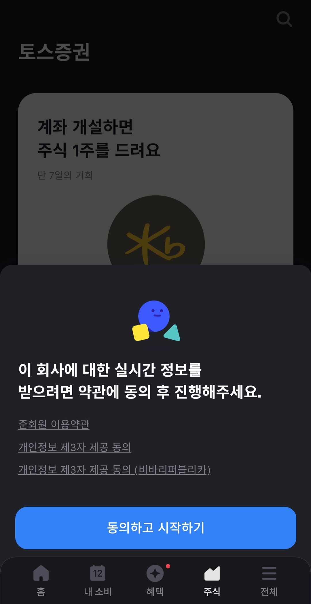 어플을 실행해서 나오는 첫 페이지 아래 메뉴에서 '주식'을 선택합니다. 그러면 바로 이벤트 페이지가 보입니다. '내 주식 확인하기'를 누릅니다.
